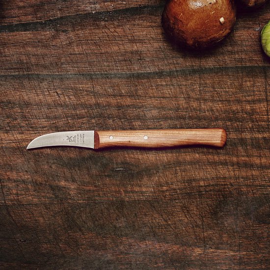 Dit aardappelmesje behoort tot de klassiekers van Robert Herder. Het heeft een langwerpig, fijn gevormd handvat en bestaat al meer dan 80 jaar. Het mes is geslepen volgens de dünnschliff methode en is daarmee eenvoudig zelf te slijpen. Het lemmet heeft een fijn gepolijste afwerking en is gevormd uit roestvrij staal met een hardheid van 56-57 HRC. Het beukenhouten heft is van Duitse bosbouw en is FSC gecertificeerd.